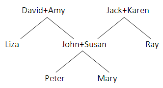 晴天。 */ father(john, peter). /* John 是 Peter 的父親。 */ father(john, mary). father(david, liza). father(david, john). father(jack, susan). father(jack, ray). mother(susan, peter). /* Susan 是 Peter 的母親。 */ mother(susan, mary). mother(amy, liza). mother(amy, john). mother(karen, susan). mother(karen, ray). loves(john, susan). /* John 愛 Susan。 */ b1([p, 2, q], p). /* 沒有特別的意思。 */ yeye(X, Y) :- father(X, T), father(T, Y). /* 如果 X 是 T 的父親,而 T 是 Y 的父親的話, 那麼 X 是 Y 的「yeye」。 */ mama(X, Y) :- mother(X, T), father(T, Y). gunggung(X, Y) :- father(X, T), mother(T, Y). popo(X, Y) :- mother(X, T), mother(T, Y). a(A1, [A | B]) :- A1 is A + 1. a(A, [B | C]) :- a(A, C).father(john, peter). |