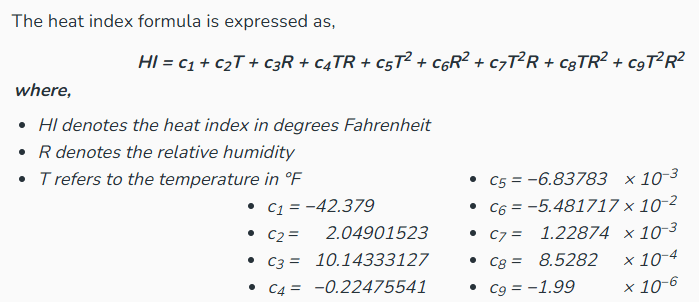 H-index = -42.379 + 2.04901523*F + 10.14333127*rh - 0.22475541*F*rh - 6.83783*Math.pow(10,-3)*F*F - 5.481717*Math.pow(10,-2)*rh*rh + 1.22874*Math.pow(10,-3)*F*F*rh + 8.5282*Math.pow(10,-4)*F*rh*rh - 1.99*Math.pow(10,-6)*F*F*rh*rh; c1 = -42.379 c2 = 2.04901523 c3 = 10.14333127 c4 = -0.22475541 c5 = -0.00683783 c6 = -0.05481717 c7 = 0.00122874 c8 = 0.00085282 c9 = -0.00000199