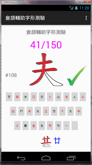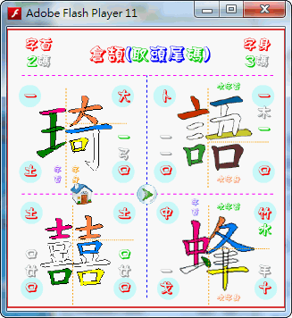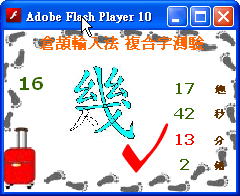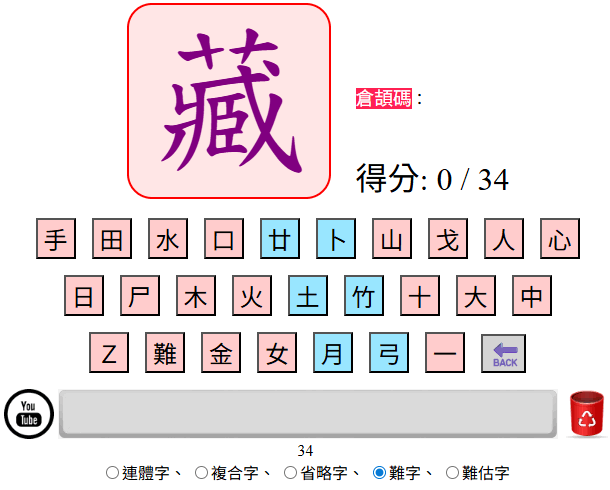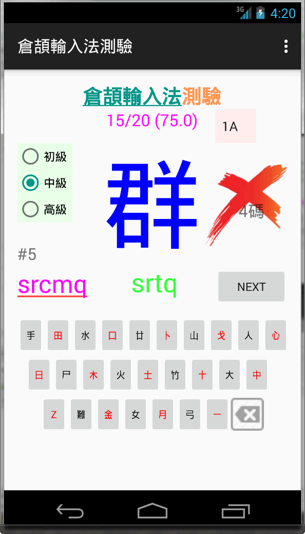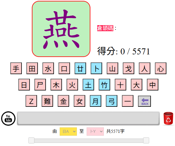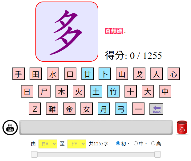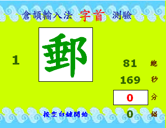 --- 倉頡測驗 (難度:初、中、高) 隨機選字:40字/測驗 ---